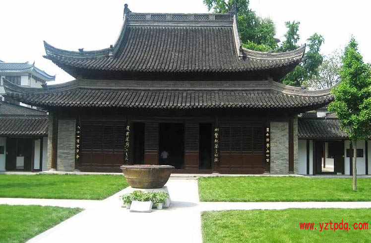 揚州八怪紀念館由西方寺改建,八怪的代表人物金農晚年即生活于寺中,以其故居為館,實在難得。西方寺建隋朝,原為避風庵,面臨大江,據說唐代時,寺前掘得三尊石佛,唐太宗敕賜“西方禪寺”,不久僧人智完遷建該寺于今址。兵燹戰火,屢廢屢修,所幸明代大殿巍然不動。大殿構架多為楠木制成,其梁架很有特色,柱頂做卷殺,成覆盆形式。梁架全部露明造,正中縫作抬梁形式,為月梁形制,山面為穿逗式。大殿內彩繪在揚州地區少見,因揚州梁架都精于雕鏤,少施彩繪,但大殿內卻遍施彩繪于梁架之上,甚至不用藻井,而以五彩遍裝,從僅存的小片彩繪分明看出,梁檁枋的彩繪為宋代風格。而大片保存完好的則是明代早期彩繪風格:構圖鮮明,多用連枝圖案,花紋輪廓簡單,色彩多用青綠及黃白互相襯托,表現花紋和底色。修復時采取了“以舊還舊”的古跡保護理論,盡量不損壞梁架造型及彩繪,使今人能窺見宋明的建筑藝術。王振世的《揚州覽勝錄》載:“清乾隆中,仁和畫師金冬心先生游揚州,嘗客寺中,后歿于世。”金農晚年信佛,專事畫佛寫經,如今的金農寄居室內復原了他的起居繪畫的陳設。他在寺中曾題詩壁上:“無佛又無僧,空堂一盞燈。杯貪京口酒,書殺剡中藤。占夢今都應,諛人老未能。此處何所想?池上鶴窺冰。”看來當時境況甚為凄涼,畫家孤燈獨臥,形只影單,但可敬者“諛人老未能”,決不趨炎附勢,寧可“池上鶴窺冰”,保持清雅和高潔,以其人品藝品方面贏得人們的緬懷。可以告慰先生的是,如今他的故居已成紀念他們的地方——八怪的紀念館,其中八怪的身平業績,飄香的翰墨都使后人瞻仰到八怪的赫赫風采。